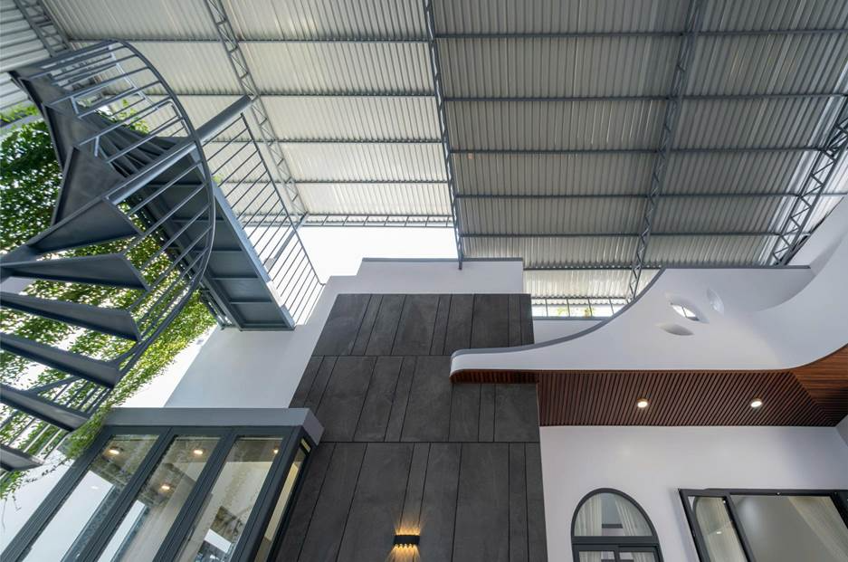 Hệ mái khéo léo tận dụng cấu trúc khung từ nhà kho cũ, không chỉ giữ lại dấu ấn công nghiệp độc đáo mà còn đóng vai trò như một tấm lá chắn khổng lồ, giảm thiểu đáng kể cái nóng gay gắt của miền nhiệt đới.